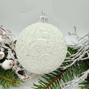 White Christmas glass Ball, Glitter Xmas Ornaments, Blown Glass Christmas ball,Handmade Paited ball Xmas 2025, Winter decor,Holiday decor